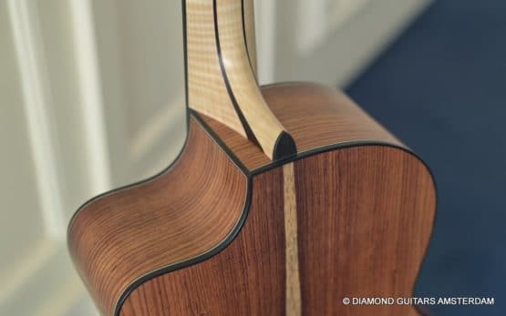 The Lowden Pierre Bensusan Signature features an armrest bevel which helps minimize any ergonomic challenges presented by the body. The Maple fingerstyle neck adds sustain and a tad of extra brightness to the guitar. The fingerstyle neck width increases as you move up the neck, providing more spacing between the outer strings and the edge of the neck at higher frets, perfect for vibrato on higher-pitched melodic lines. The Bensusan signature model exhibits the distinctive Lowden tone. Difficult to put into words, but hard to forget once you’ve heard it. The sound is loud and full, with meaty lower mids, a strong bass, and ringing highs. The combination of AAAA Madagascar Rosewood and Adirondack Red Spruce offers a tremendous sustain and dynamic response. This is a lively instrument, with lots of overtones and sympathetic vibrations that leap out effortlessly.