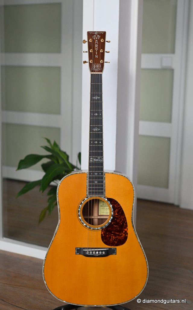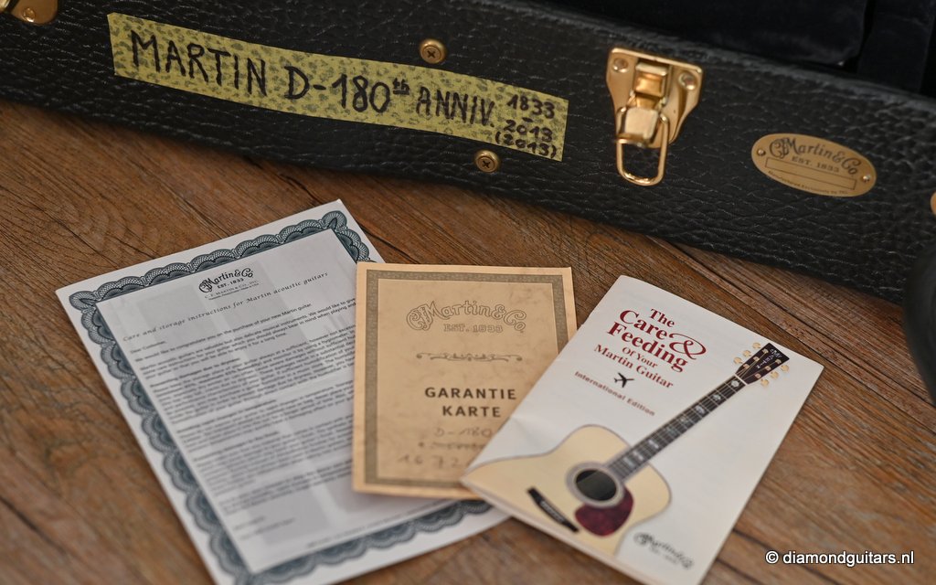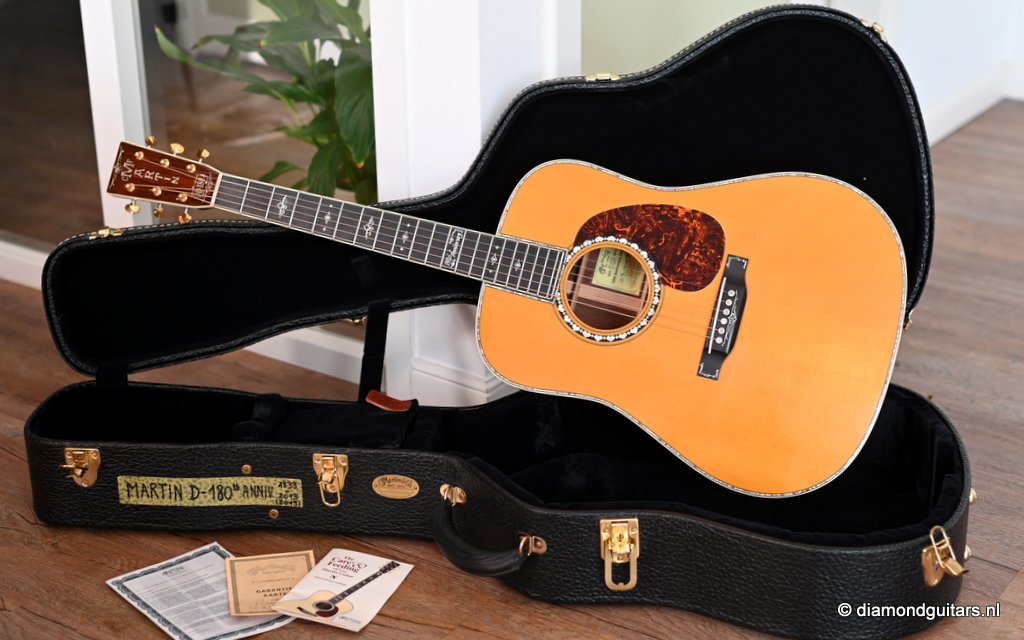 The modern Martin D-45 is a distinctive guitar and top of the line. This D-180 is way above that mark. This guitar’s label is signed by Christian Frederick Martin IV and numbered sequentially. Click the following link for the full Martin Custom Shop specs-list Martin D-180 #4 of 25. She has been played, but always treated well. Signs of use are visible up close but no scratches. One very tiny ding on the top. A Martin Certified Luthier repaired the back binding leading to an excellent condition rating. In short, this Anniversary Edition guitar is a daily feast for the eye and ear. It’s the perfect guitar for any guitar aficionado & collector. Listen to a sound impression here: