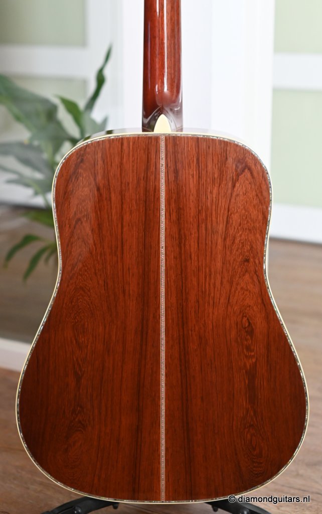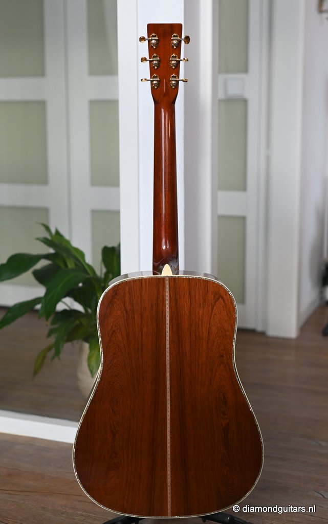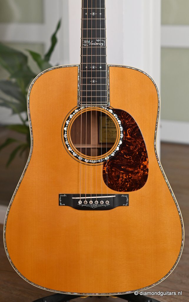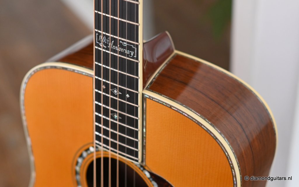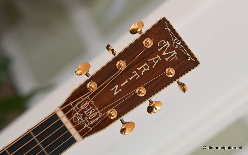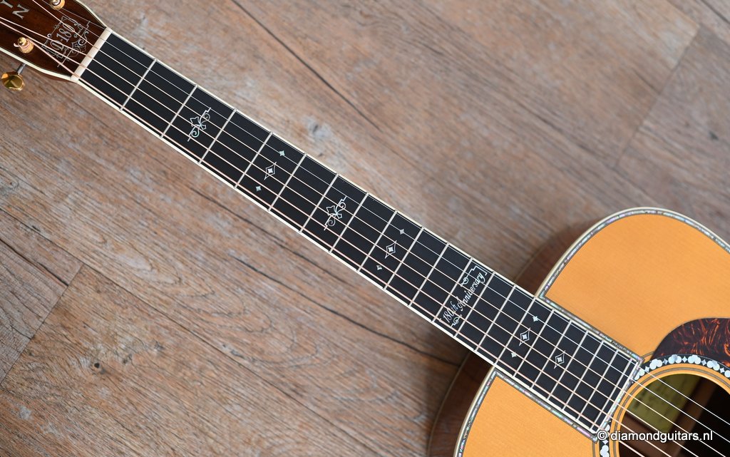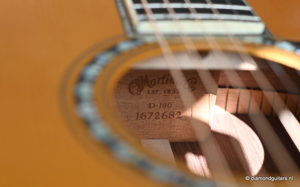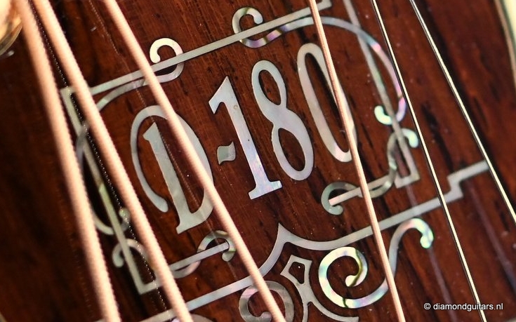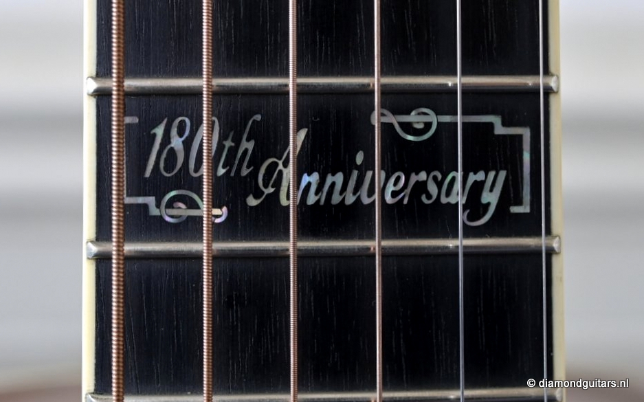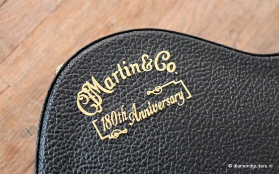 This Martin D-180 is build to commemorate the 180th birthday of the Martin Guitar Company. She is based on the flagship model, the D-45, and built by the Custom Shop team. Martin choose Madagascar Rosewood and a ‘pre-war’ fine-grained Adirondack Red Spruce top with the Golden Era Forward Shifted Adirondack Bracing featuring special design inlaid Abalone on the top, headstock and neck.