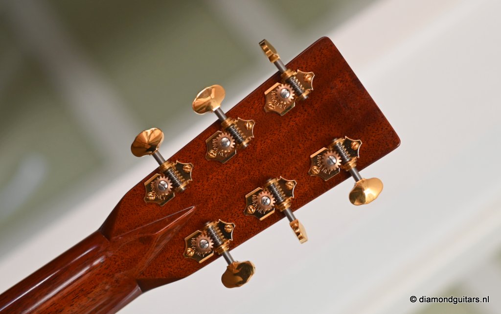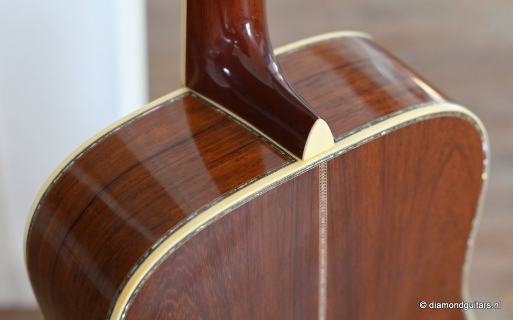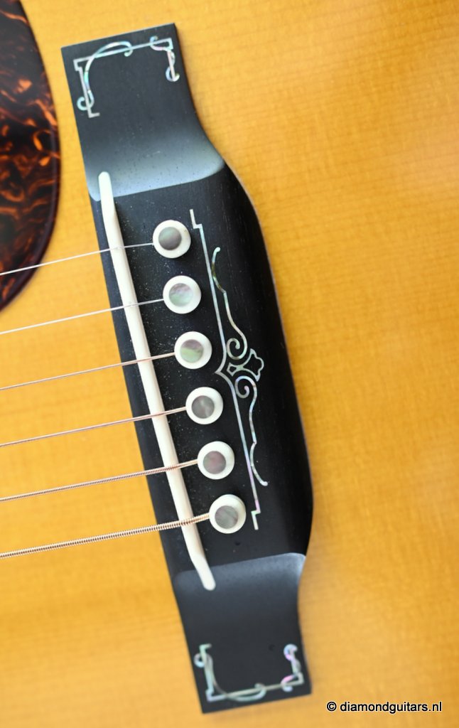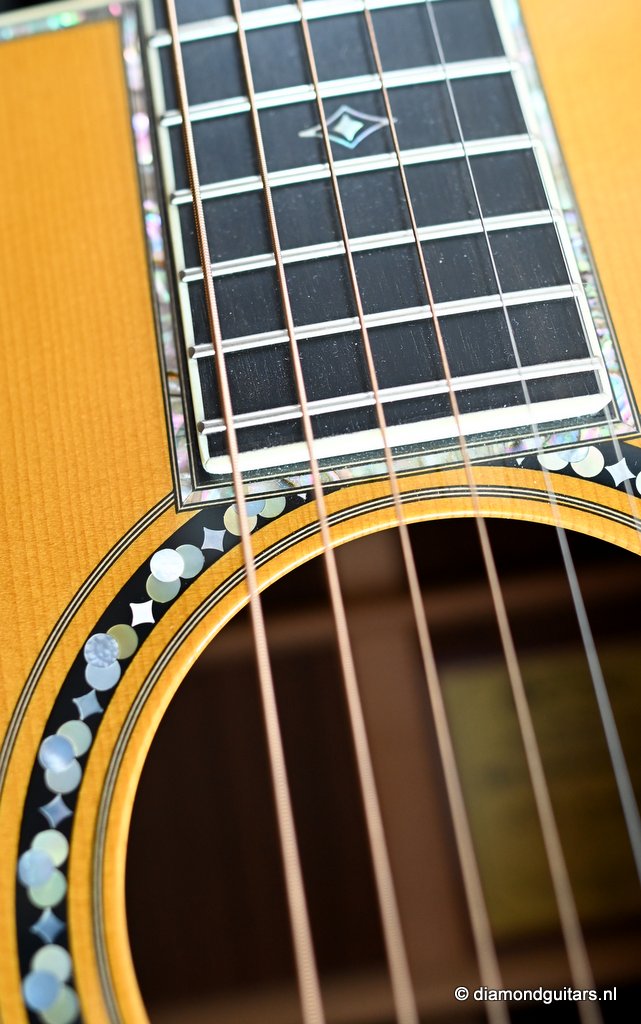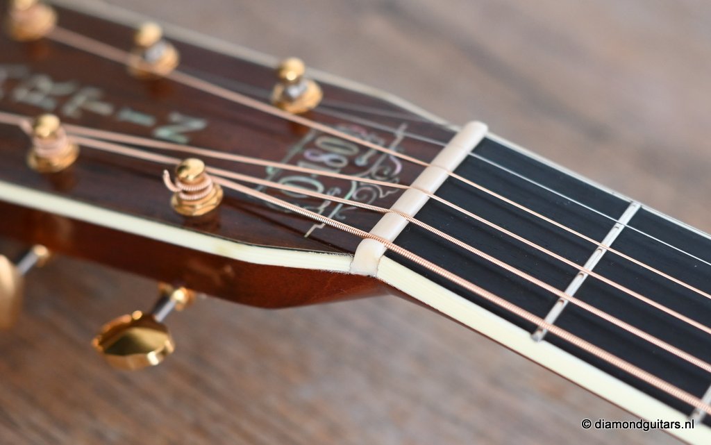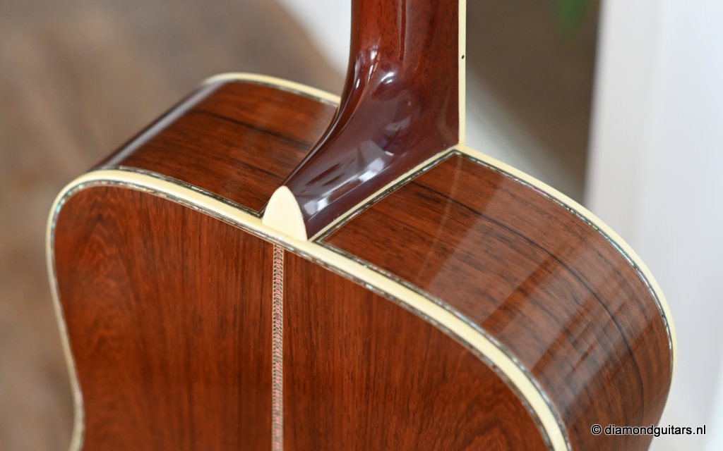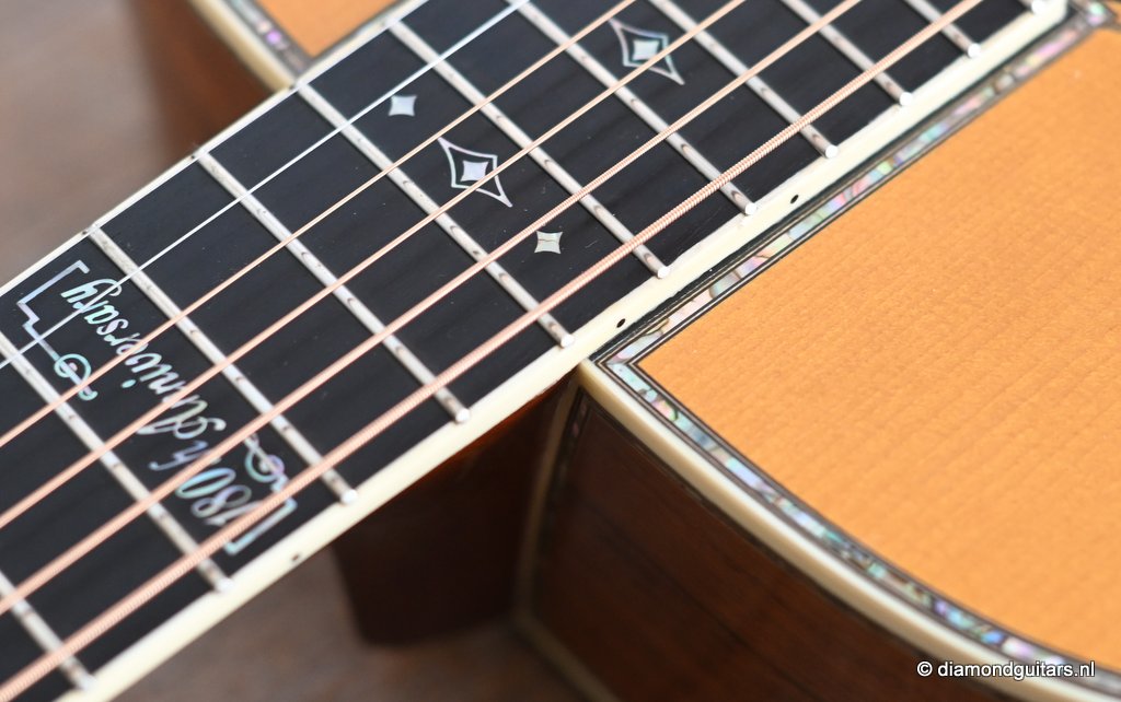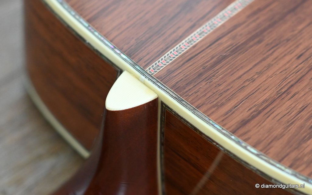 This awesome Martin D-180 has it all and then some. On top of the 45-style abalone inlay, Martin added the exquisite soundhole inlay. IMHO, this is amongst the most stylish inlay I have ever seen. She’s just so elegantly dressed, never posh. Superb looks and even more important: from a tonal point of view, this Martin is amongst the best of the best. Martin uses the term Golden Era for a variation of their Scalloped Bracing. This type of Scalloping is more aggressive compared to a standard scallop. With Golden Era Scalloping, there is more wood shaved from the Braces and the X brace is a little tighter fit. This variation of scalloping helps the tone and responsiveness, by letting the top vibrate more freely. Tight grained Adirondack, well played in offers full bass notes and meaty highs. Just awesome! Overtones splatter all over the room. Flatpicking, strumming and fingerpicking this magnificent instrument will overwhelm you with inspiration and lead you to new musical horizons.