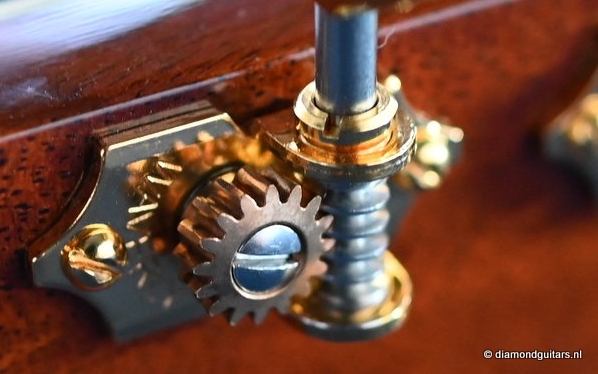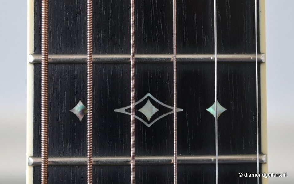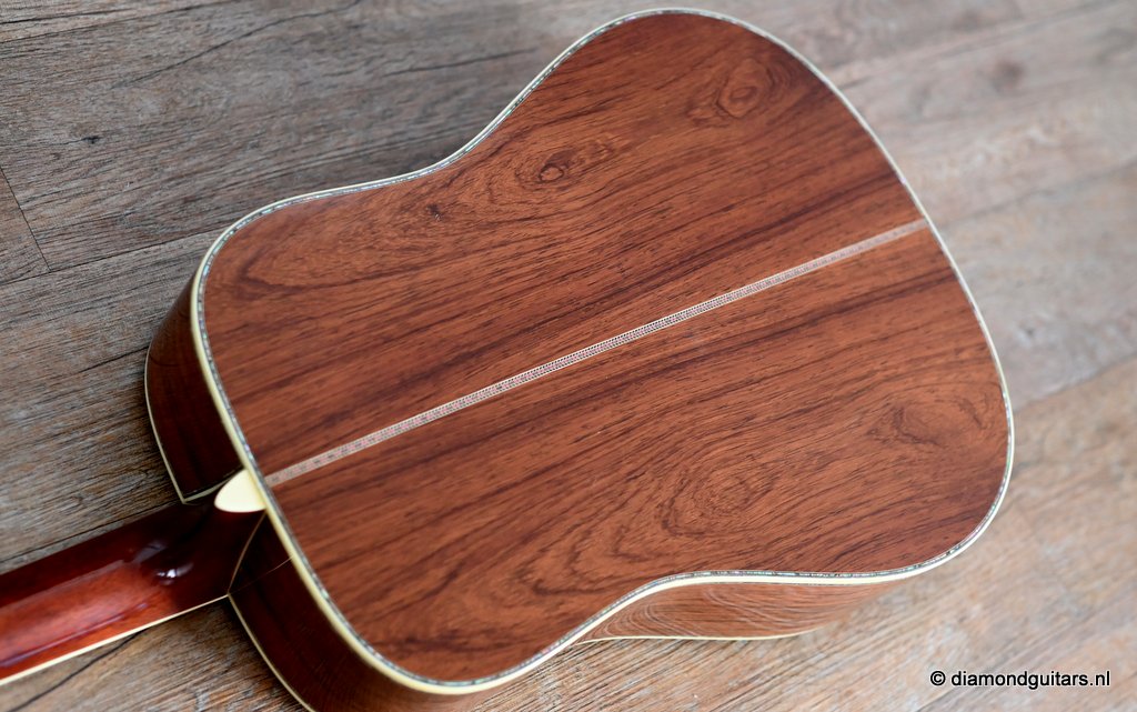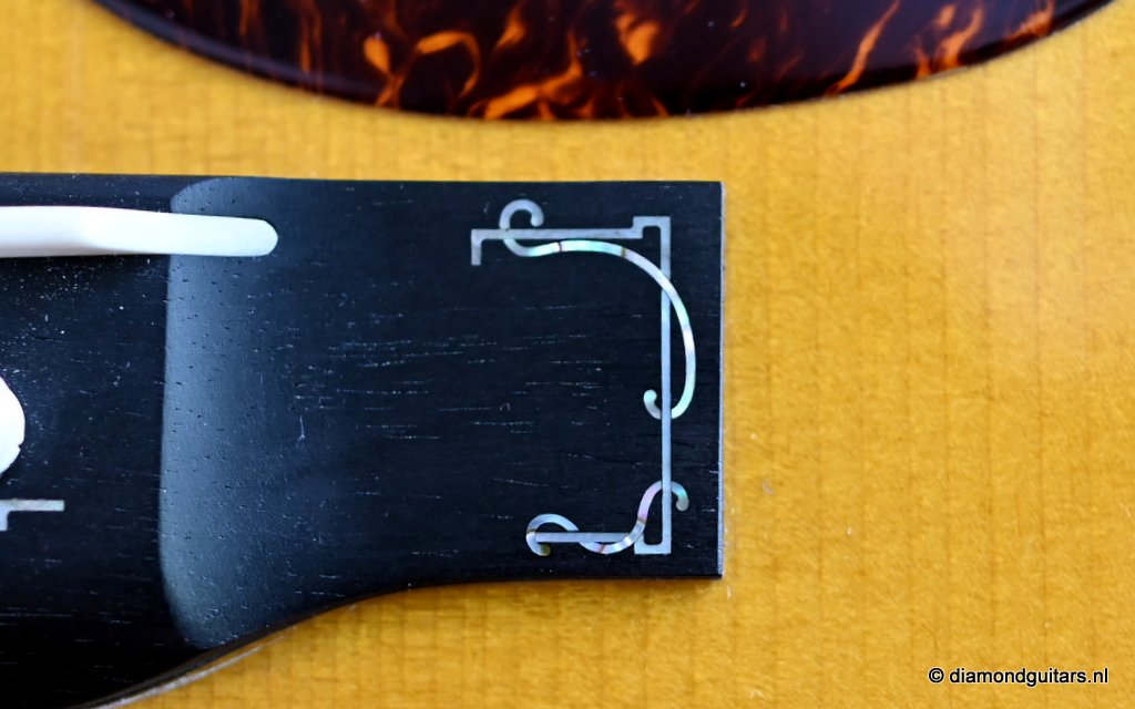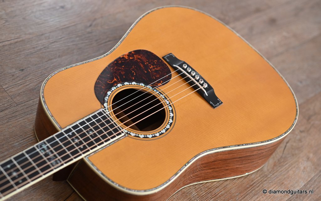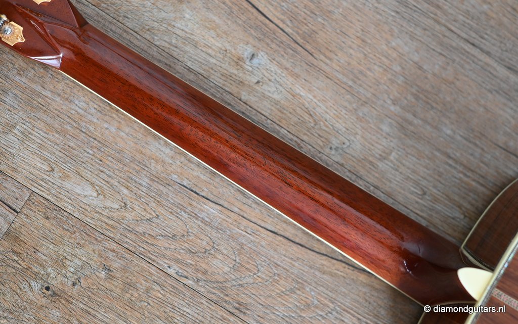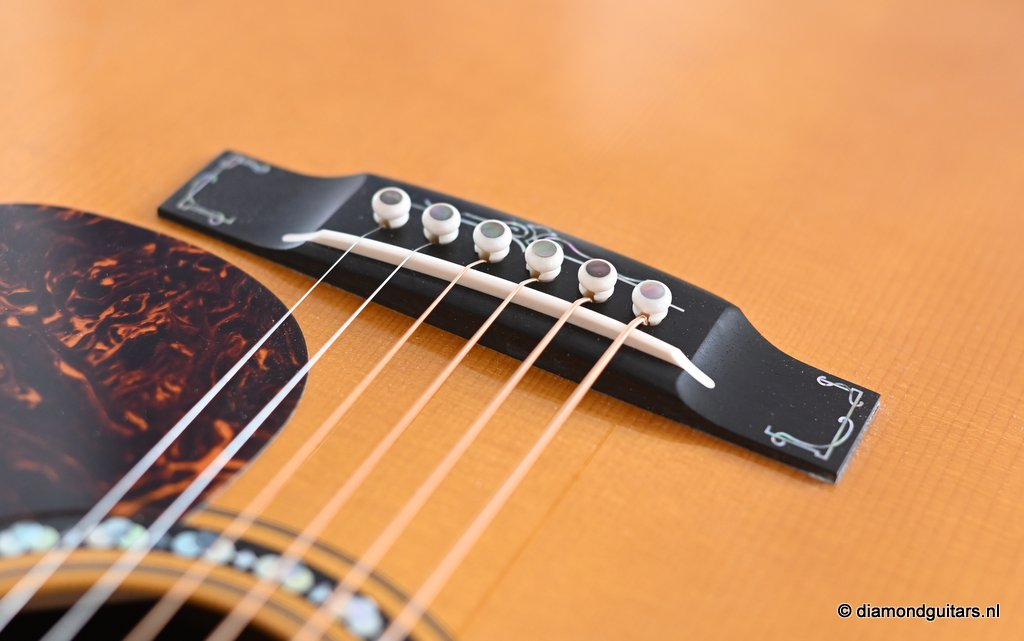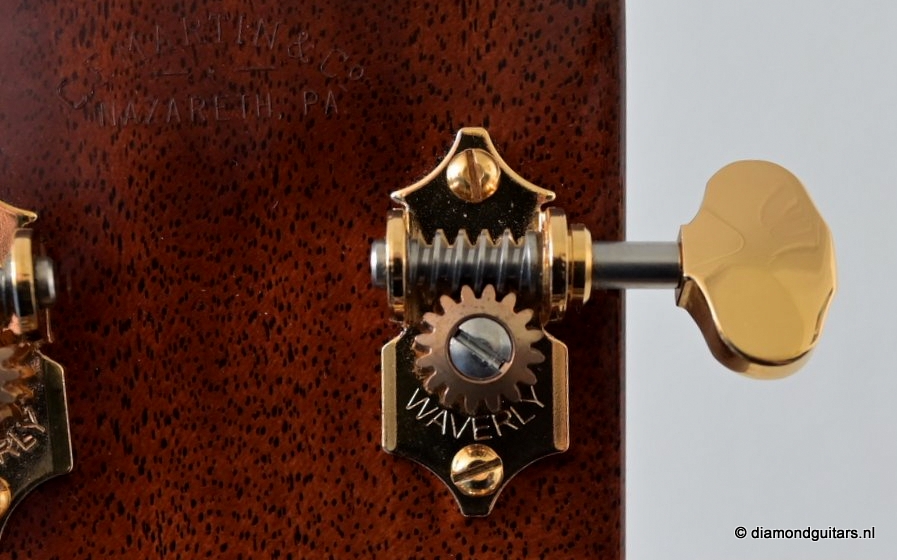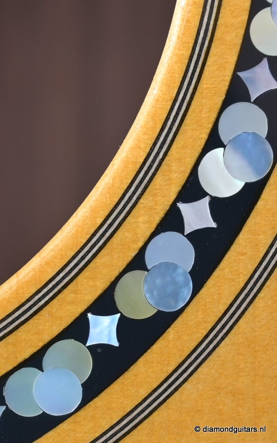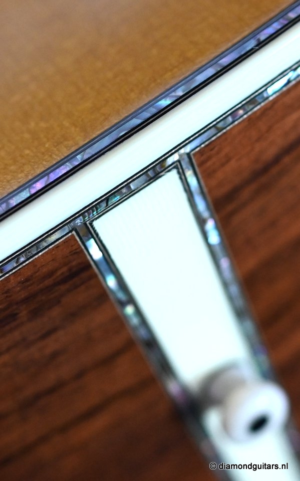 This awesome Martin D-180 has it all and then some. On top of the 45-style abalone inlay, Martin added the exquisite soundhole inlay. IMHO, this is amongst the most stylish inlay I have ever seen. She’s just so elegantly dressed, never posh. Superb looks and even more important: from a tonal point of view, this Martin is amongst the best of the best. Martin uses the term Golden Era for a variation of their Scalloped Bracing. This type of Scalloping is more aggressive compared to a standard scallop. With Golden Era Scalloping, there is more wood shaved from the Braces and the X brace is a little tighter fit. This variation of scalloping helps the tone and responsiveness, by letting the top vibrate more freely. Tight grained Adirondack, well played in offers full bass notes and meaty highs. Just awesome! Overtones splatter all over the room. Flatpicking, strumming and fingerpicking this magnificent instrument will overwhelm you with inspiration and lead you to new musical horizons.